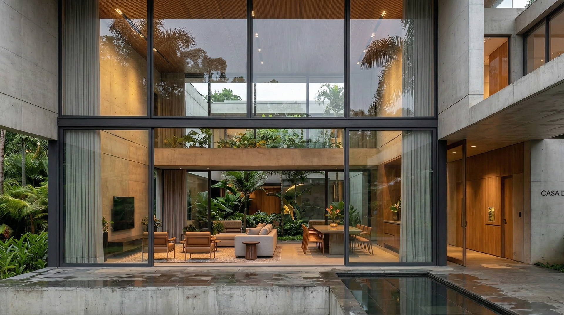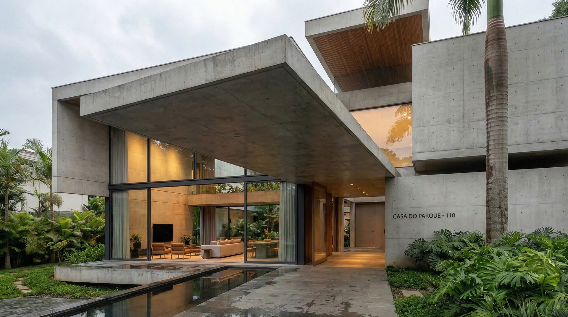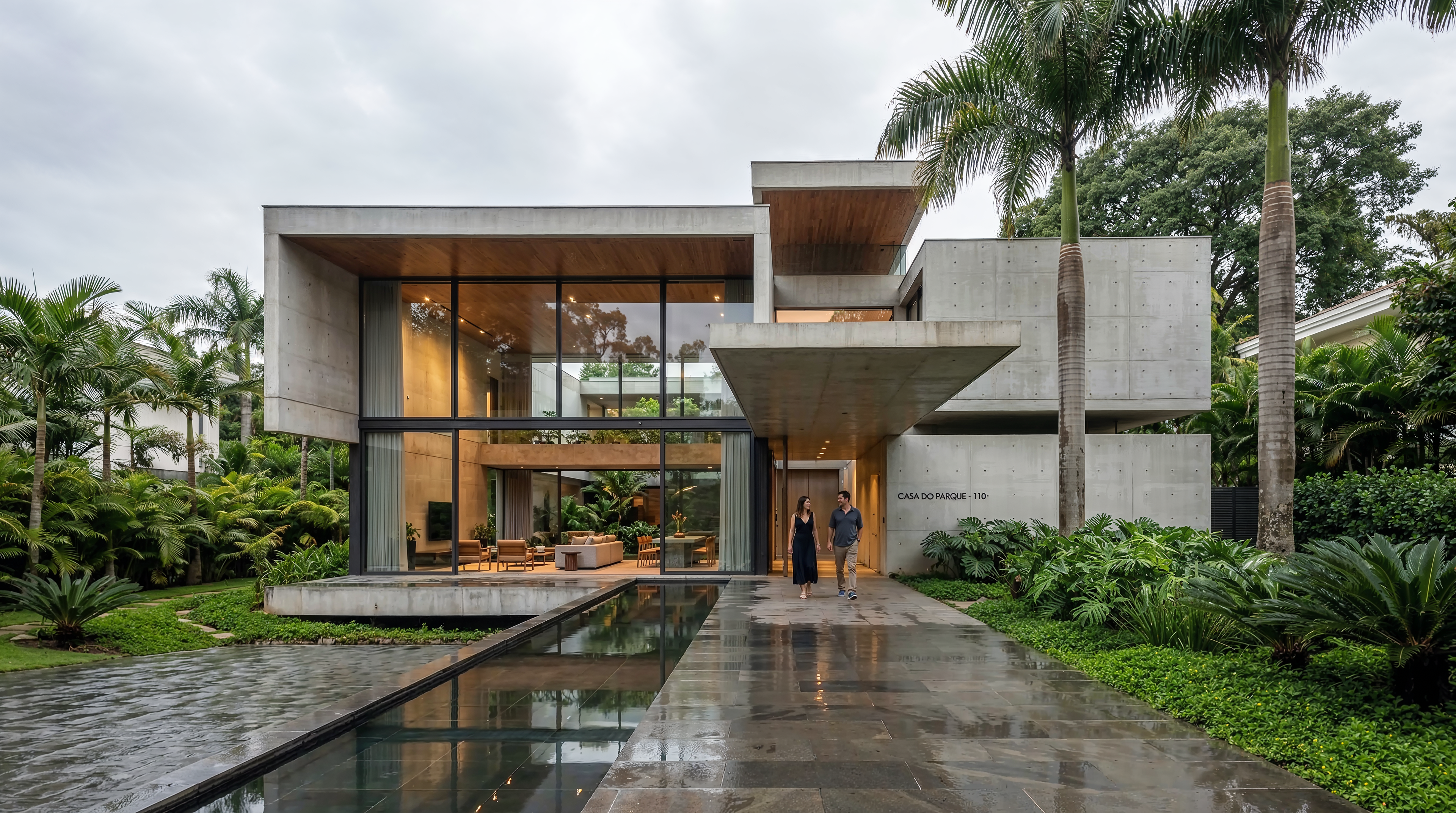 Uma residência organizada em torno de espelhos d’água e volumes minimalistas. A composição explora reflexos, silêncio visual e a relação entre arquitetura e paisagem.