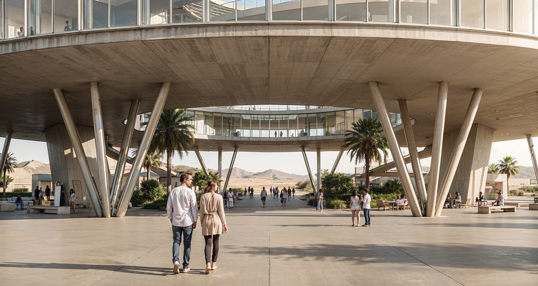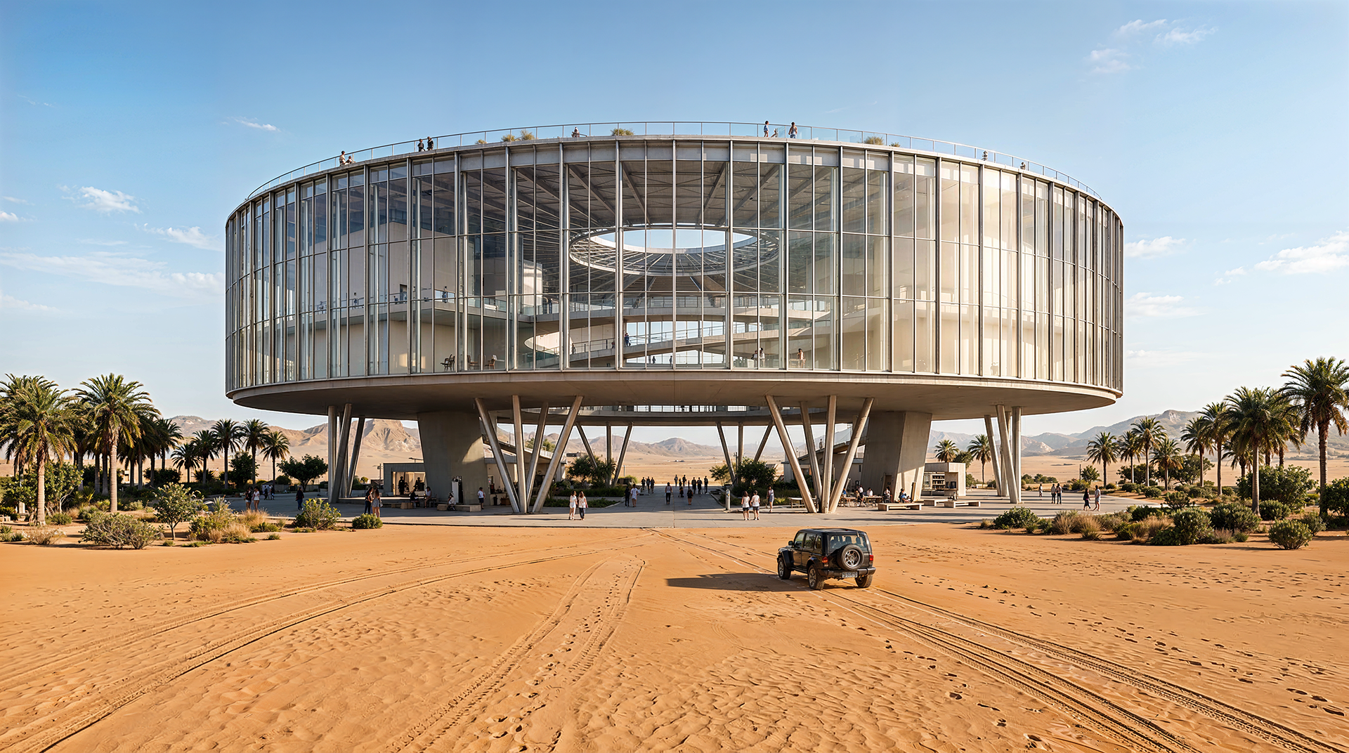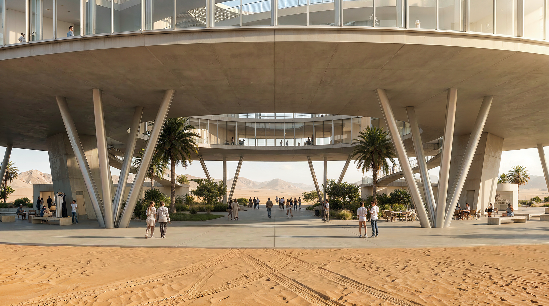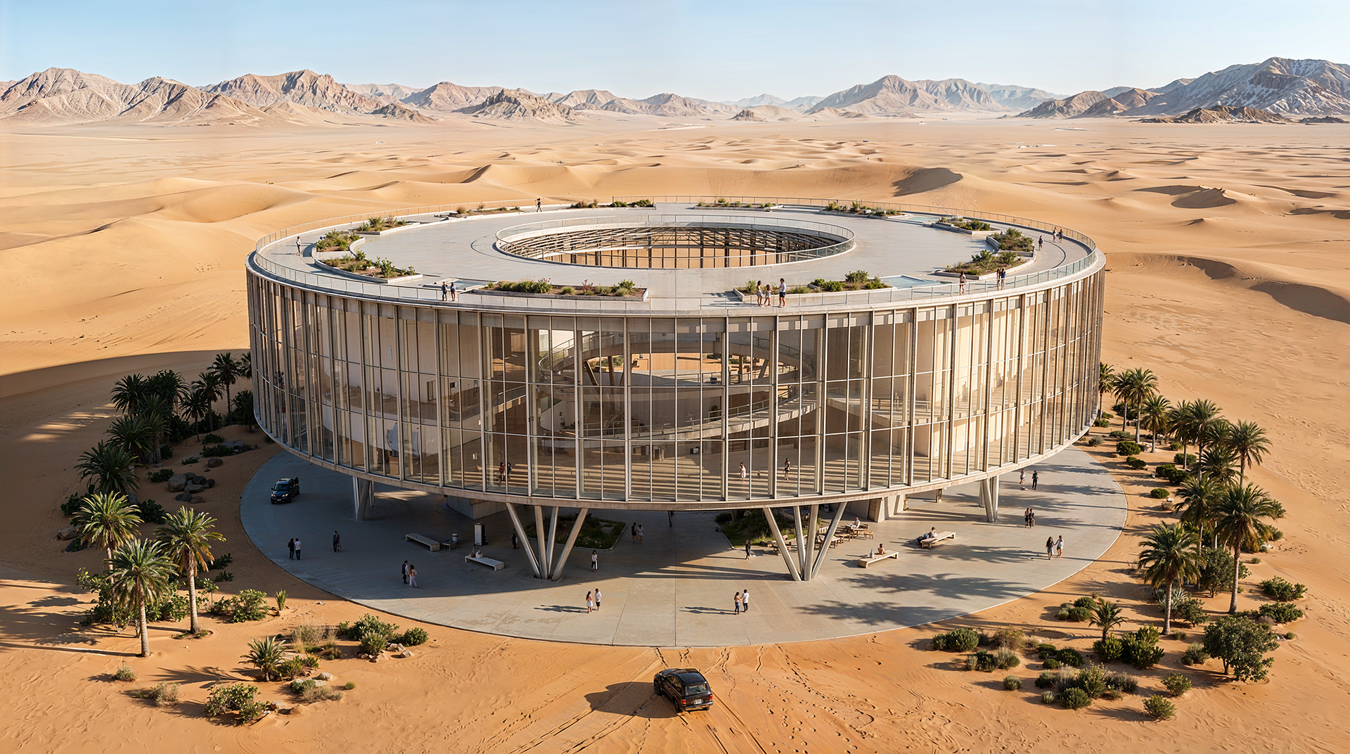 Uma arena cultural circular implantada em uma paisagem desértica de grande escala. O projeto investiga transparência, monumentalidade e a relação entre arquitetura contemporânea e paisagens extremas.