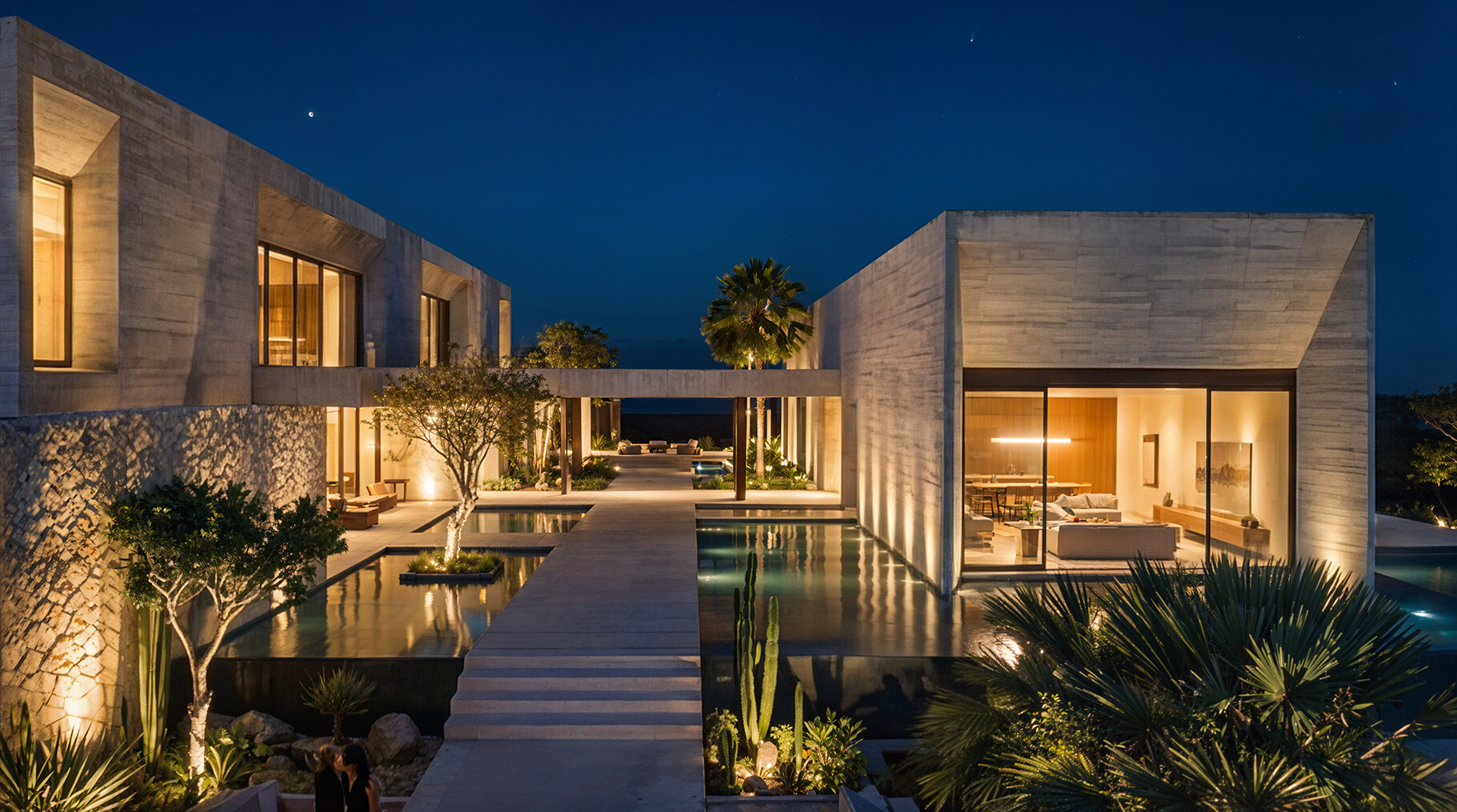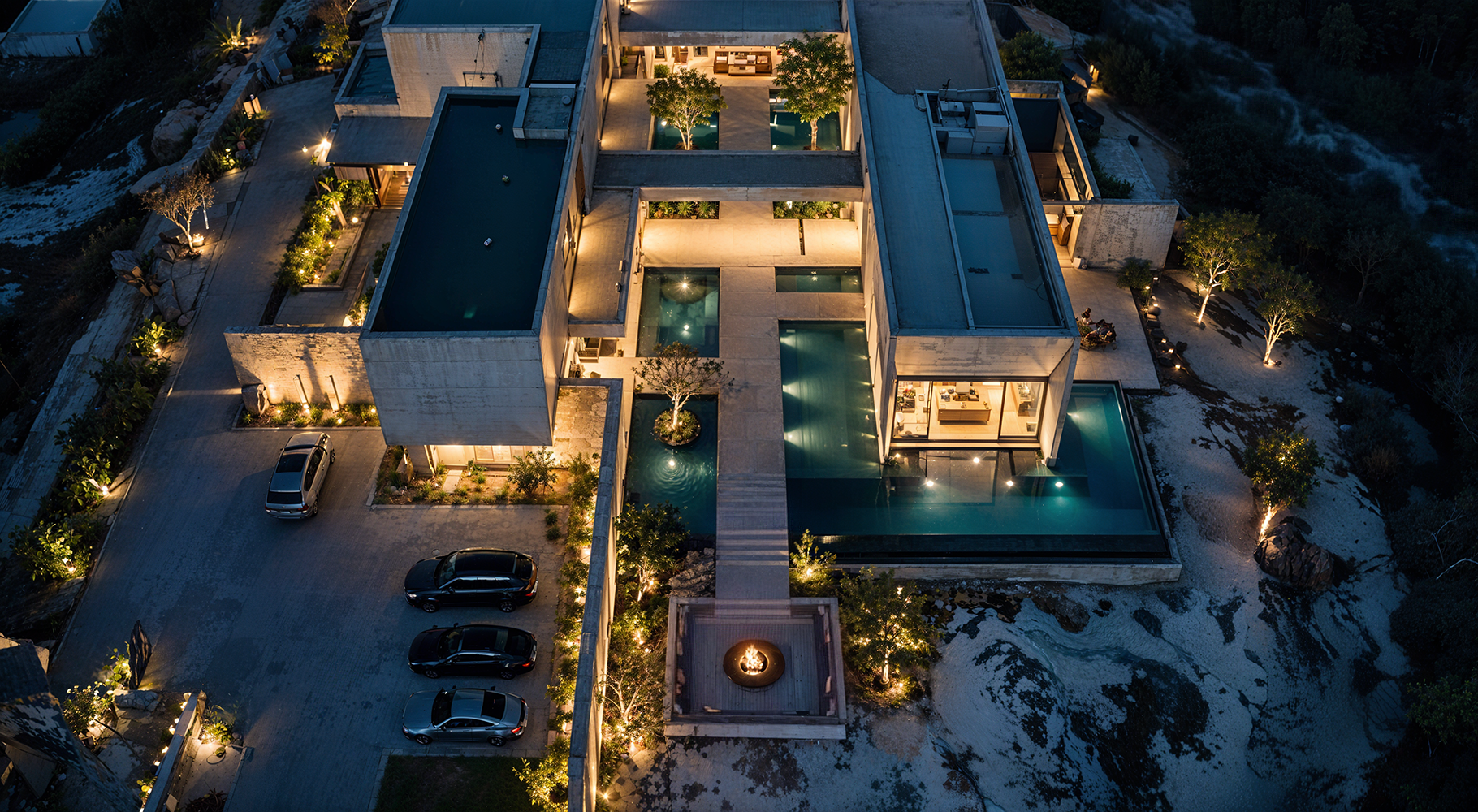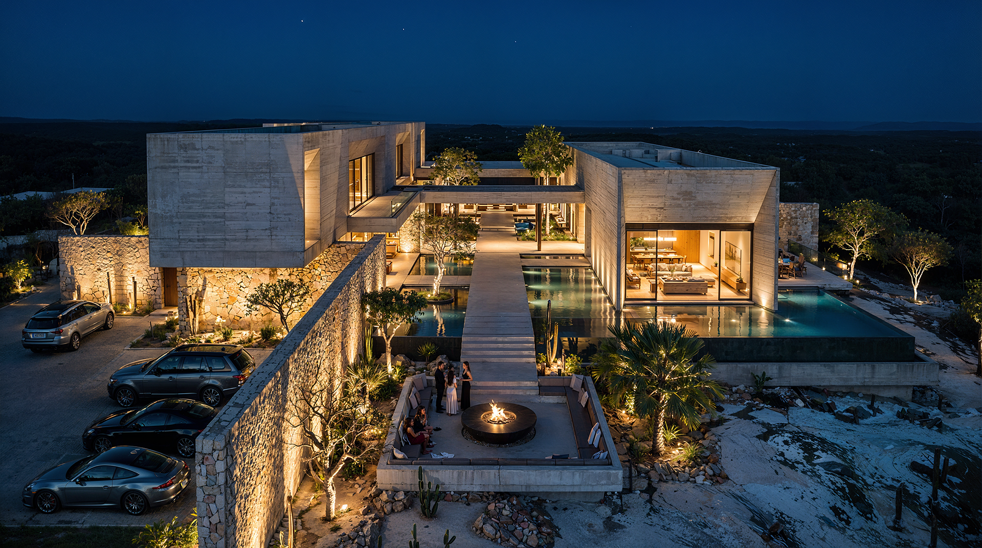 Uma residência de luxo implantada em no sertão brasileiro. A arquitetura se integra à rocha natural, oferecendo terraços panorâmicos em meio ao árido clima brasileiro