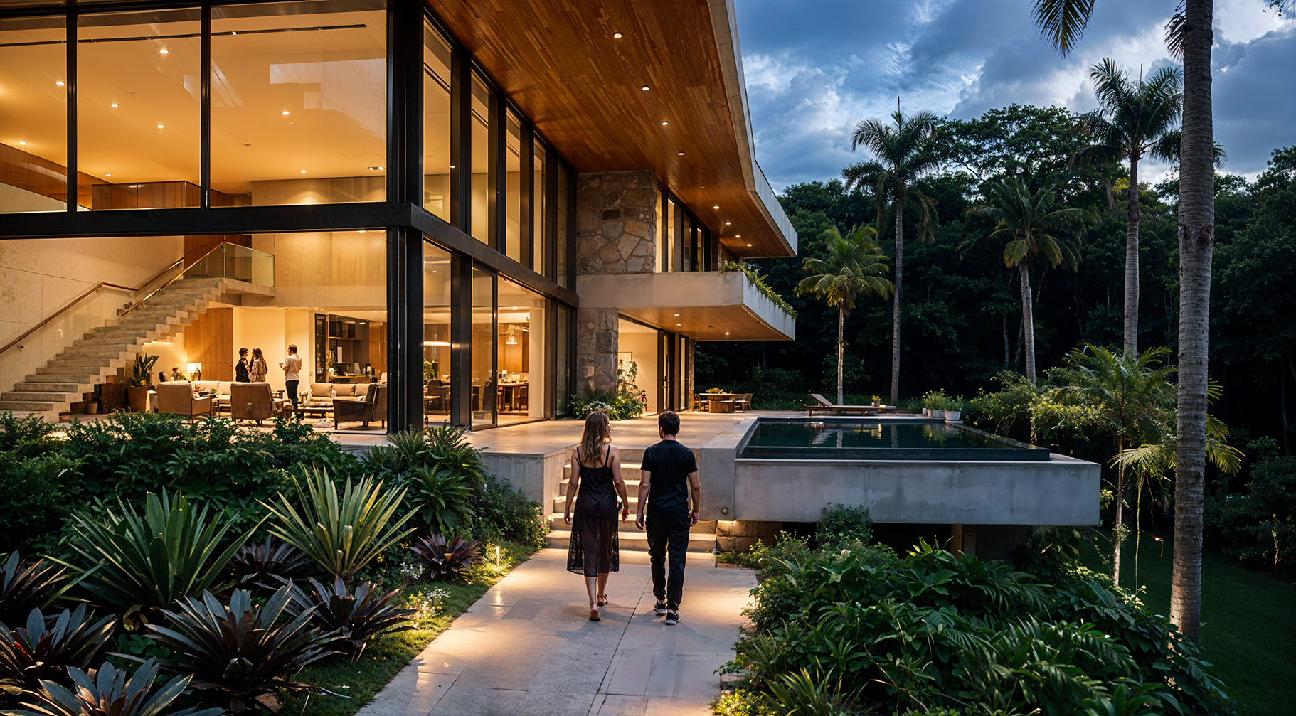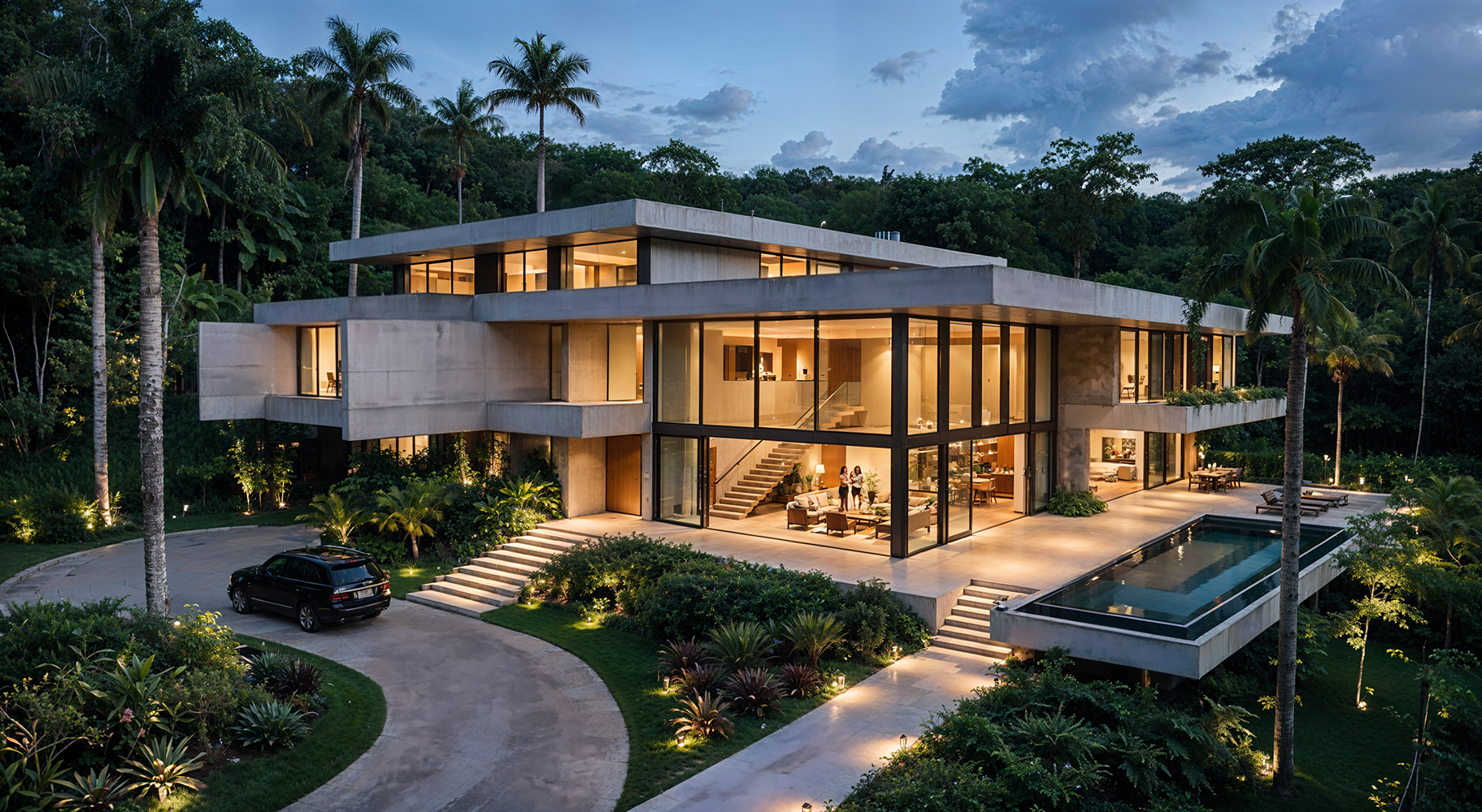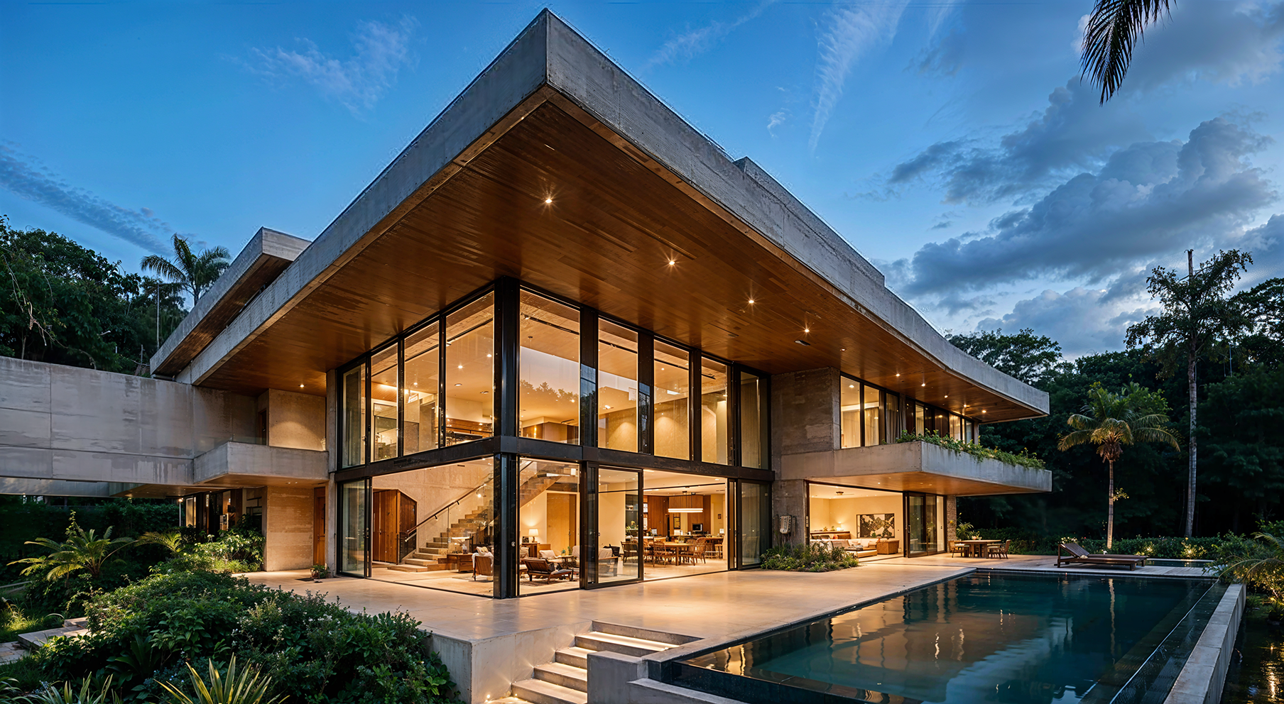 Uma residência contemporânea composta por volumes horizontais, grandes planos de vidro e integração com o paisagismo tropical. O estudo enfatiza abertura espacial, ventilação natural e conexão com o jardim.