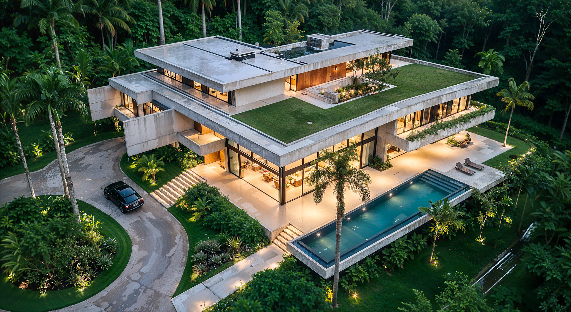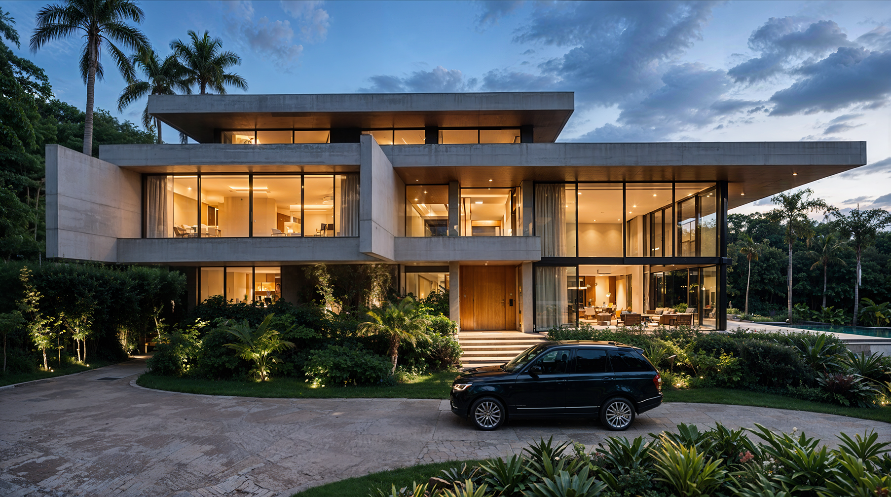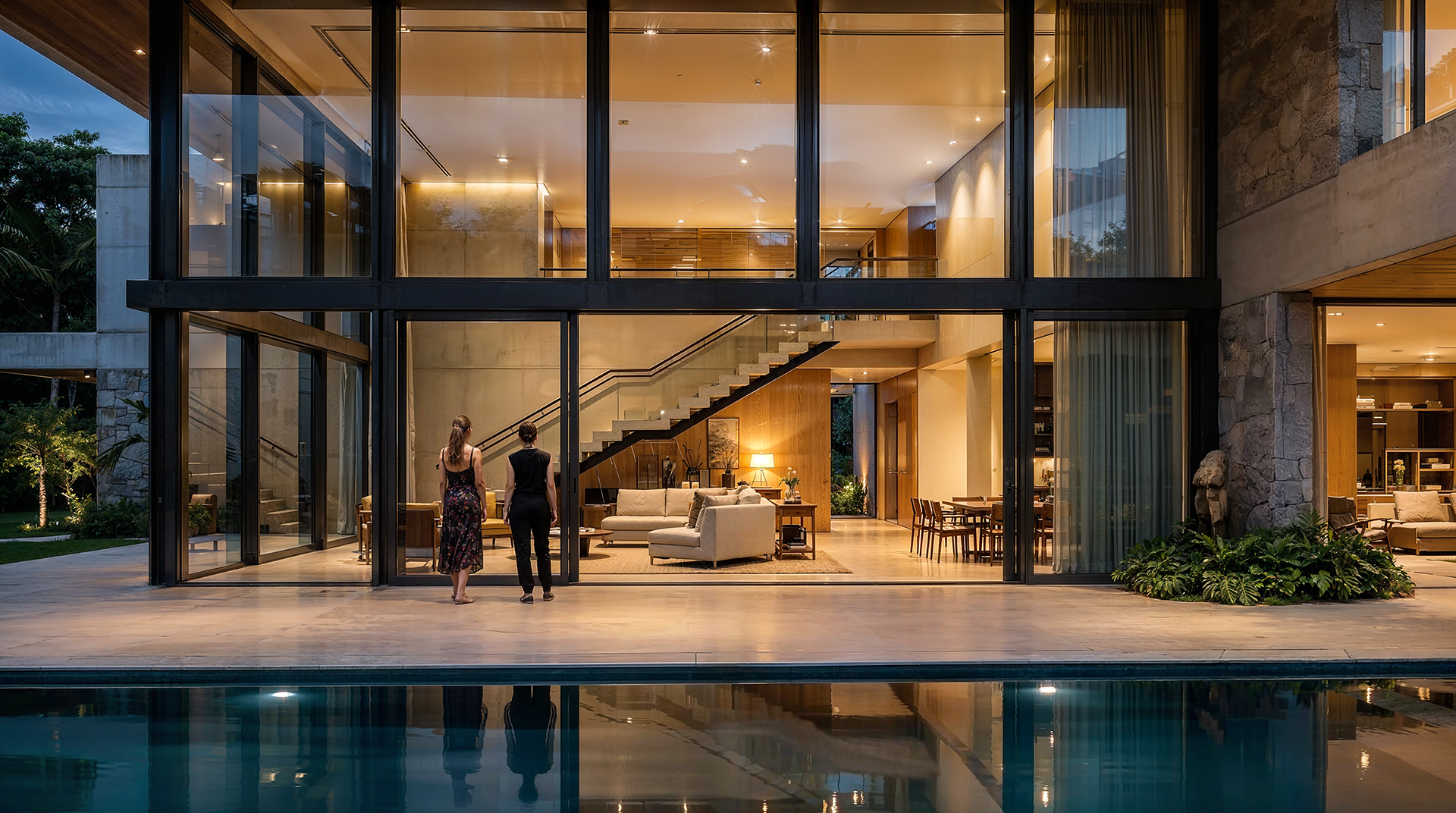 Uma residência contemporânea composta por volumes horizontais, grandes planos de vidro e integração com o paisagismo tropical. O estudo enfatiza abertura espacial, ventilação natural e conexão com o jardim.